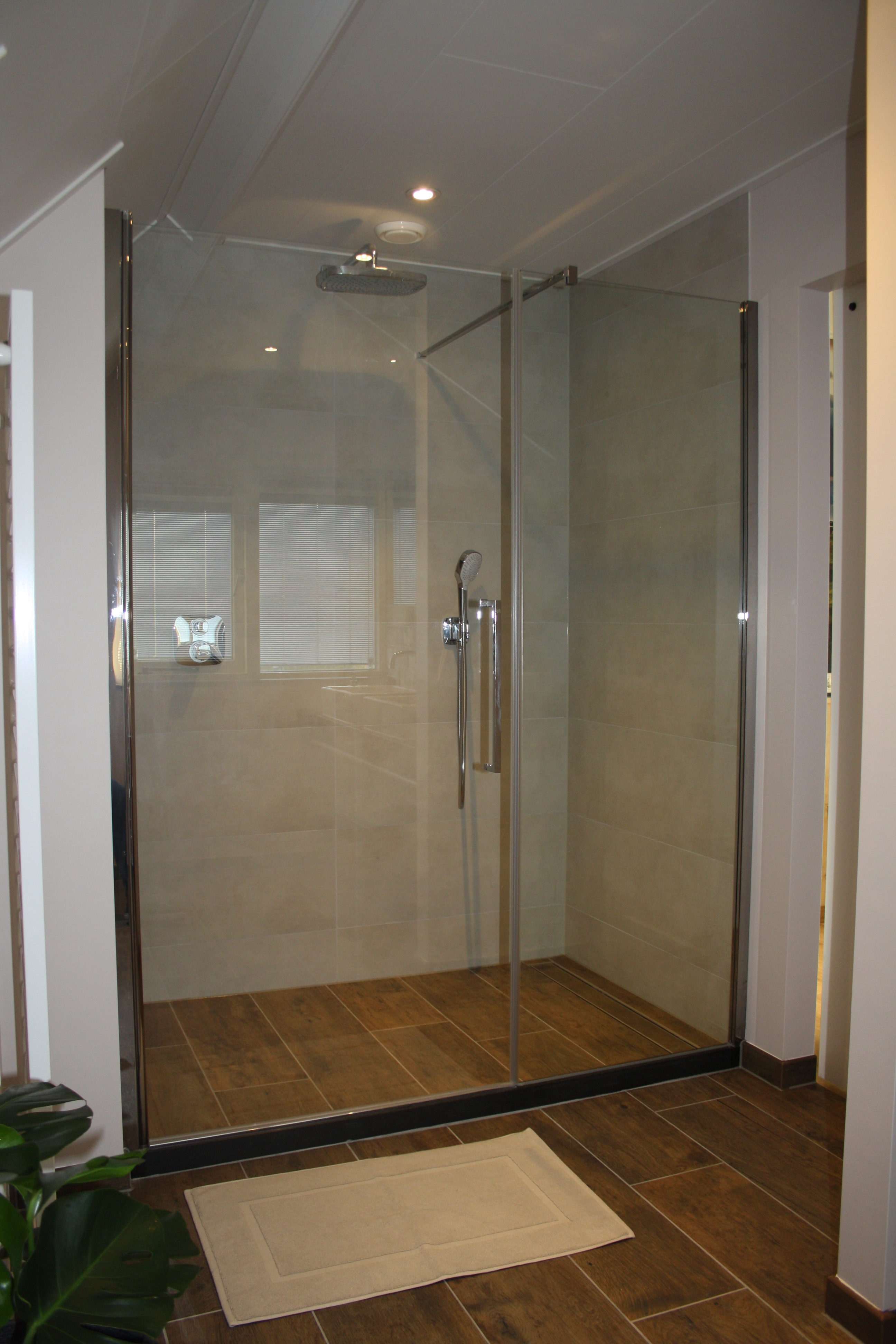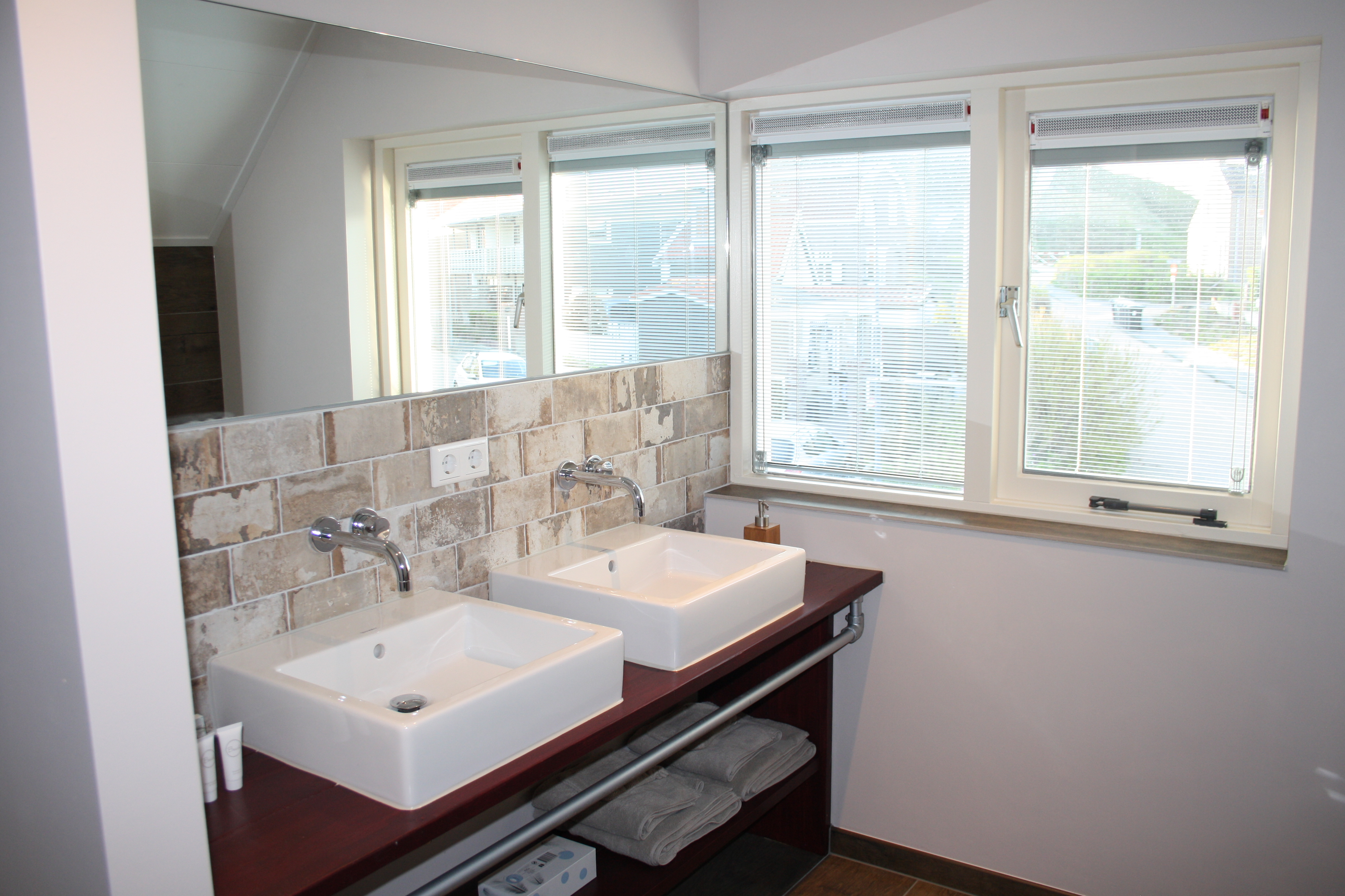 De badkamer heeft een grote douchecabine met regendouche en handdouche. Er is een dubbele wastafel met haarföhn en een toilet. Handdoeken liggen voor u klaar.