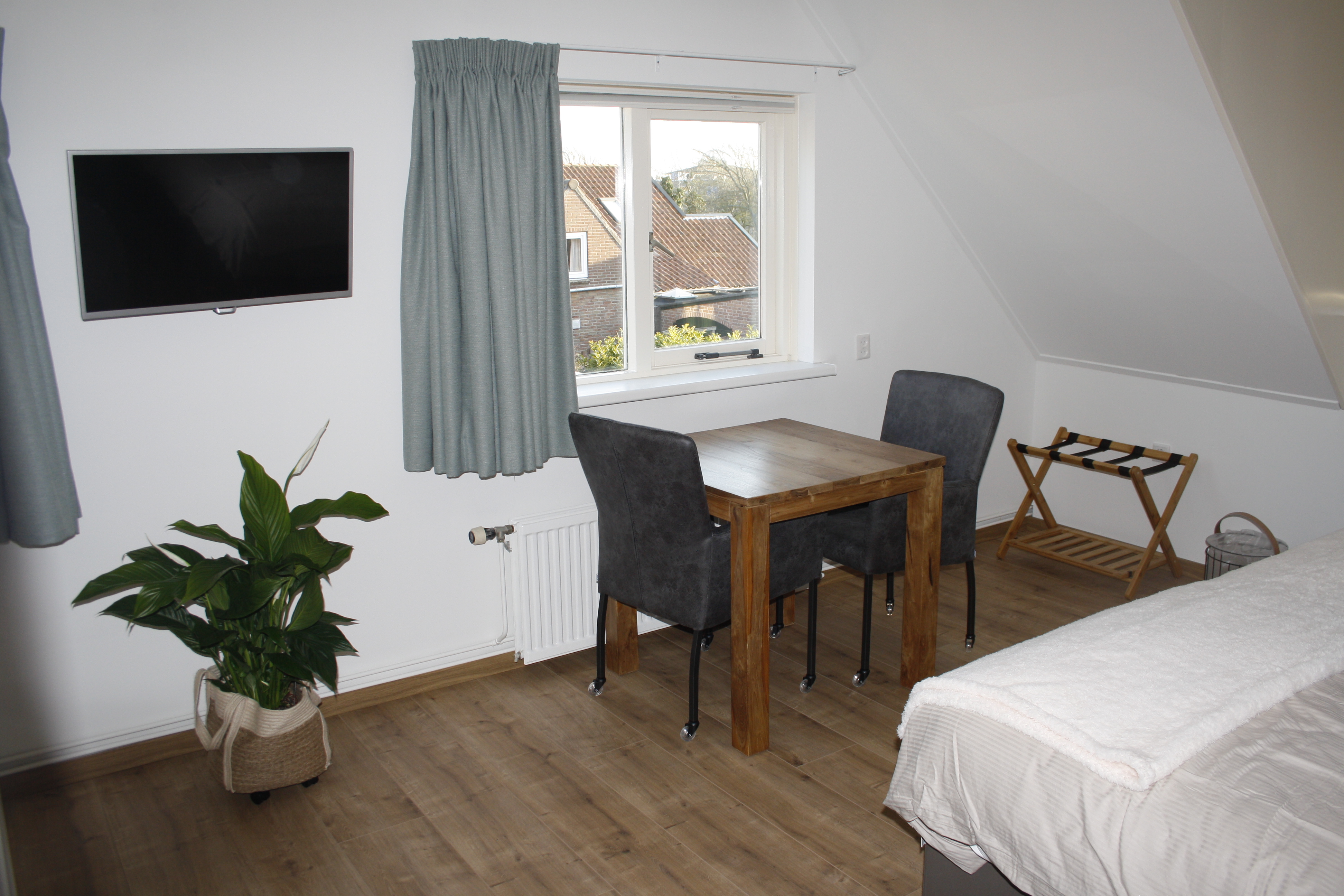 In de kamer is een ontbijttafel met 2 comfortabele stoelen, een kledingkast en een pantry.